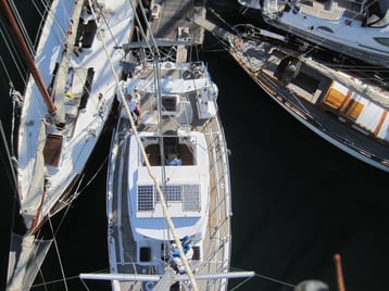 Op het achterdek is een zwemtrap bevestigd, er is ook een warme douche. Met een opblaasbare bijboot komen wij droogvoets op de oever.